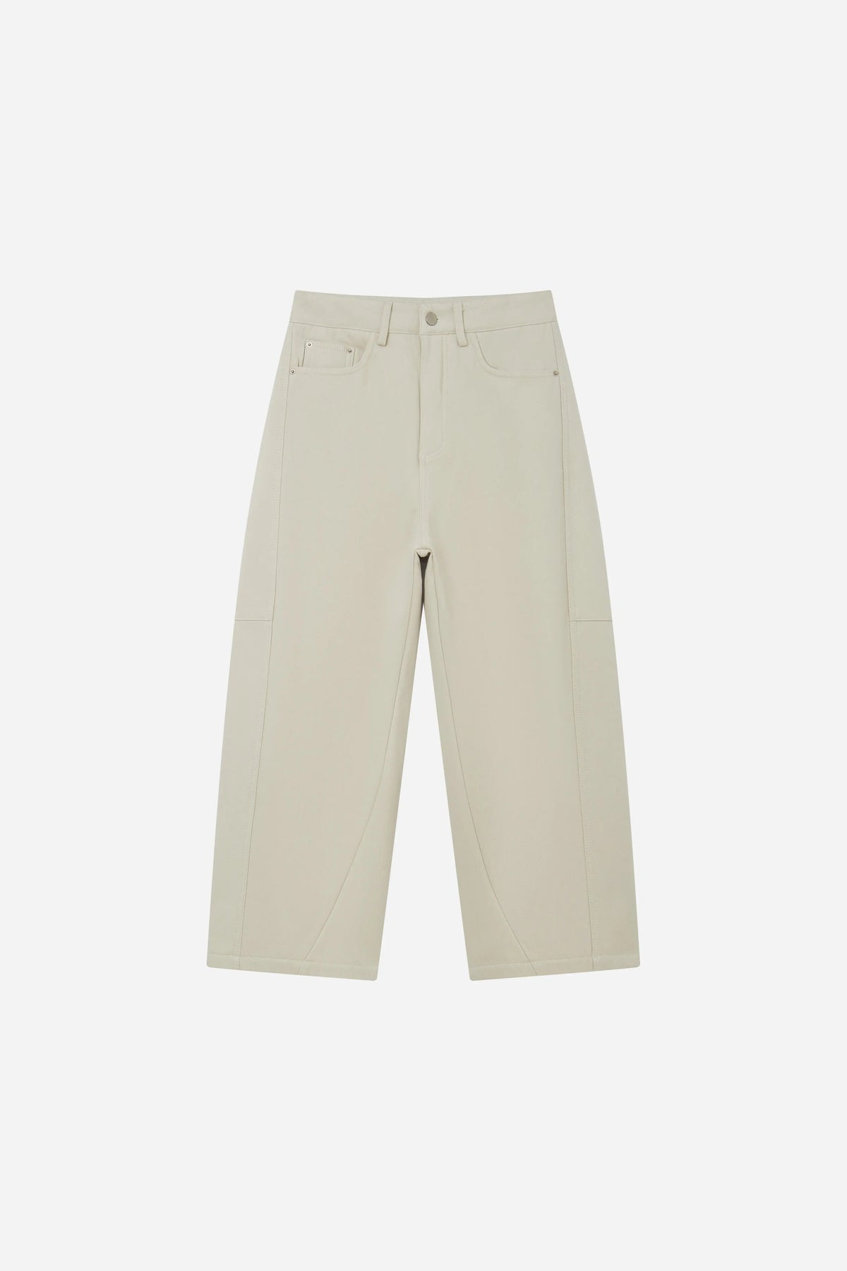 Master the silhouette of the season with the S42203 Mid-Rise Cotton Barrel Pant. This piece is defined by its distinct "barrel" leg shape—curving outward at the thigh and tapering sharply at the ankle—to create a structural, fashion-forward outline. Cut from substantial 100% rigid cotton, it sits comfortably at the natural waist (mid-rise), making it an easy, everyday alternative to high-waisted styles. Featuring classic 5-pocket rivet detailing, it combines the ruggedness of denim with a sculptural, modern fit.