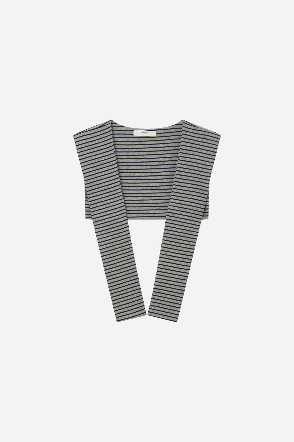 Achieve the classic preppy aesthetic instantly with the S59204 Striped Mock-Sweater Shoulder Wrap. This innovative accessory is designed to mimic the look of a pullover casually tied around the neck, but without the bulk or weight of a full garment. Constructed from double-layered jersey fabric, it has the thickness and drape of real knitwear. The Black and Grey Stripe pattern adds a graphic, sporty touch to simple t-shirts or dresses.