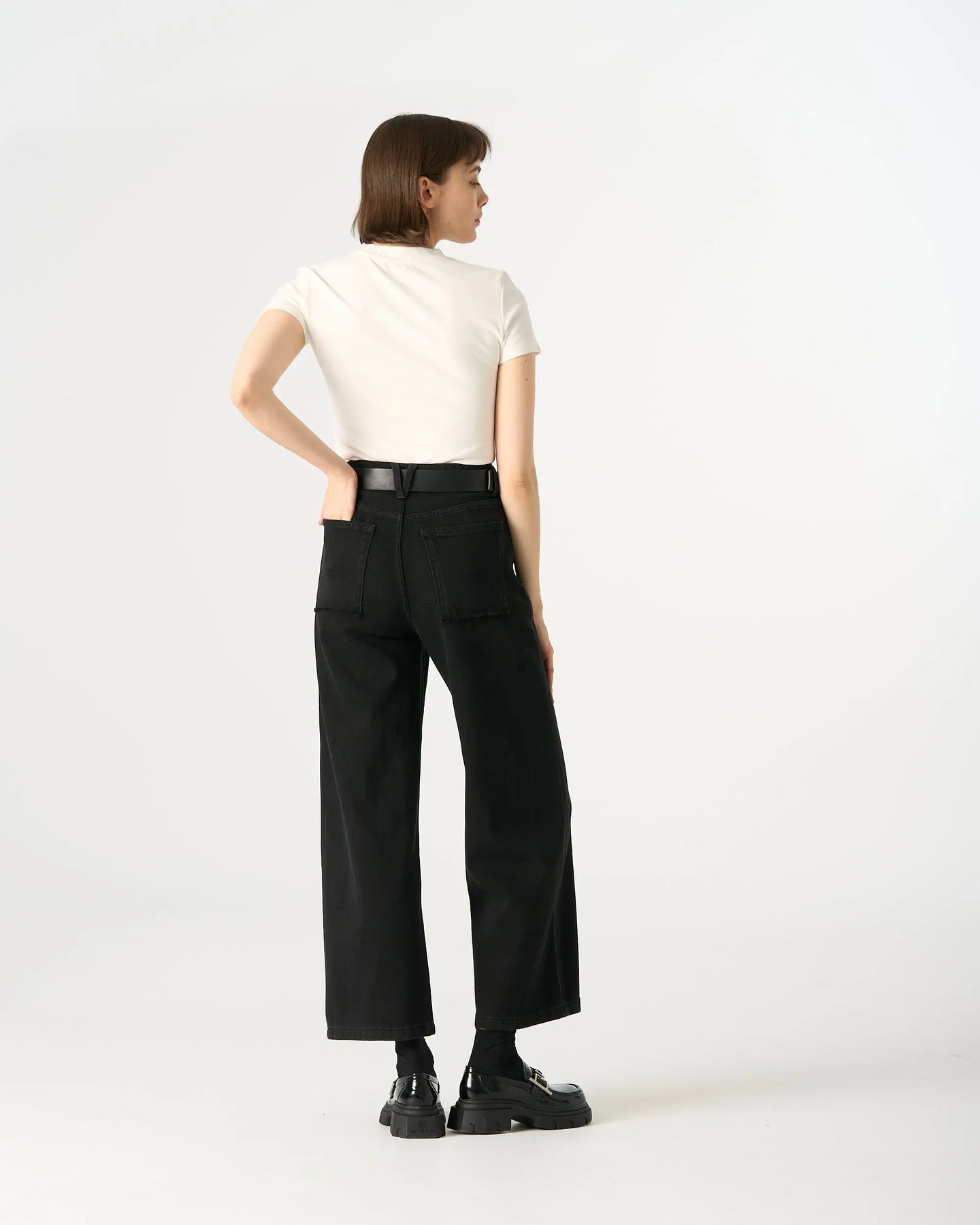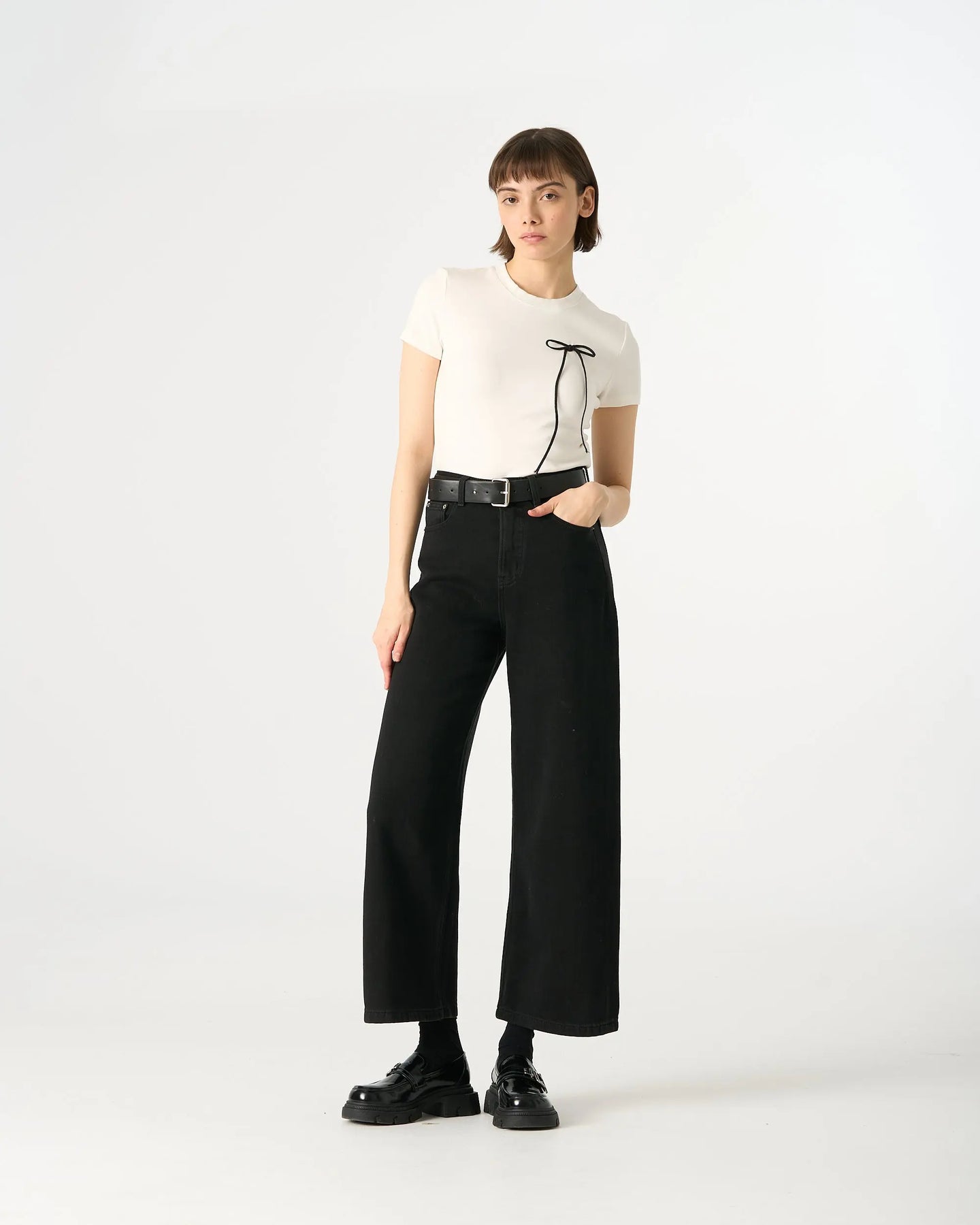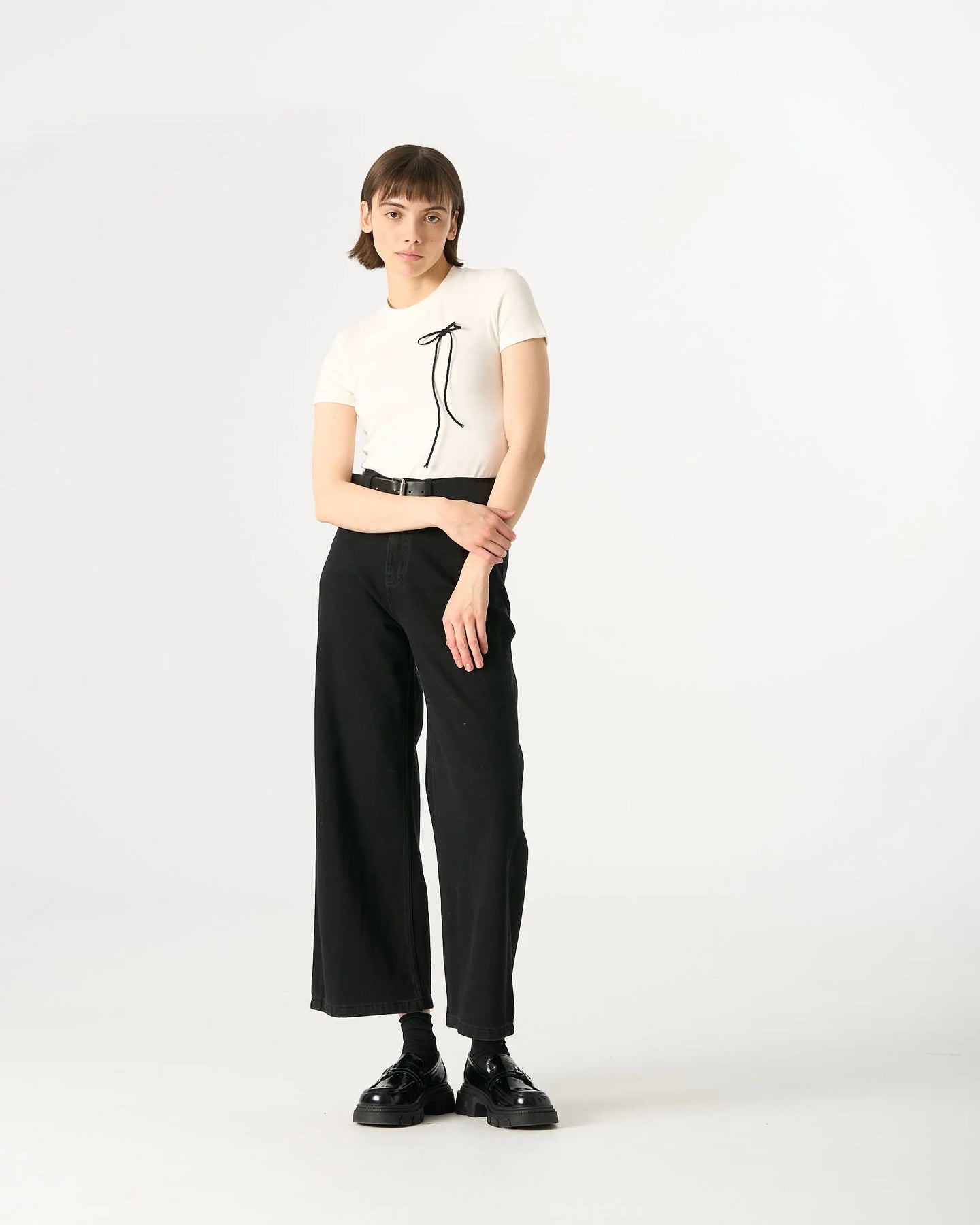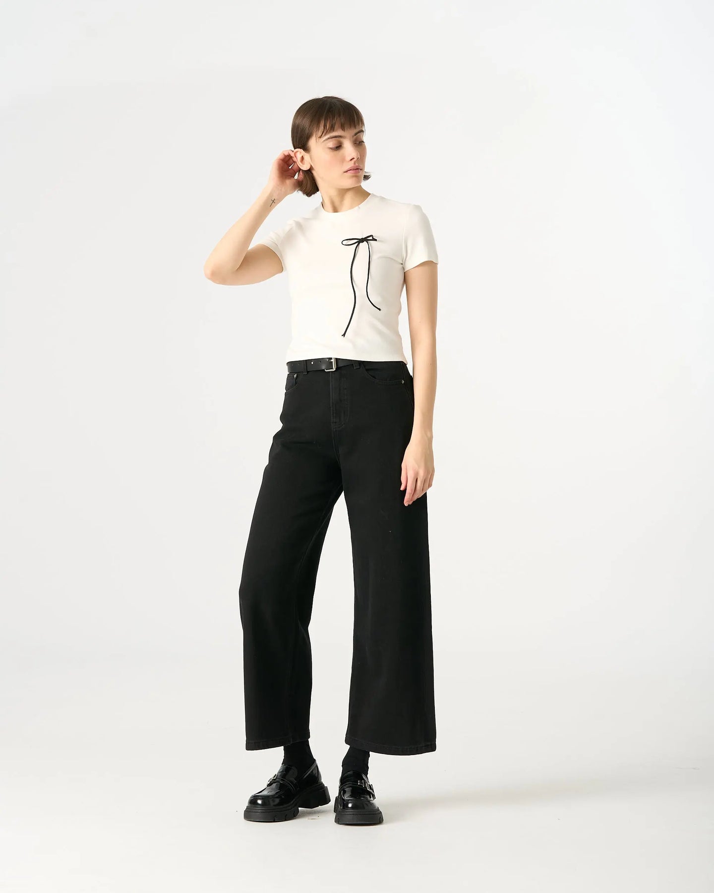 A reimagined everyday essential. This t-shirt upgrades the standard cotton tee with a luxurious hand feel provided by the high rayon content. The silhouette is timeless with a round neck and straight hem, but the addition of the minimalist black bow creates a striking visual contrast. It is lightweight, stretchy, and designed to retain its shape. A sophisticated choice for building a capsule wardrobe with personality. Available in White, Dark Grey, and Dark Brown.